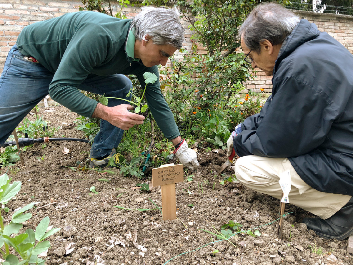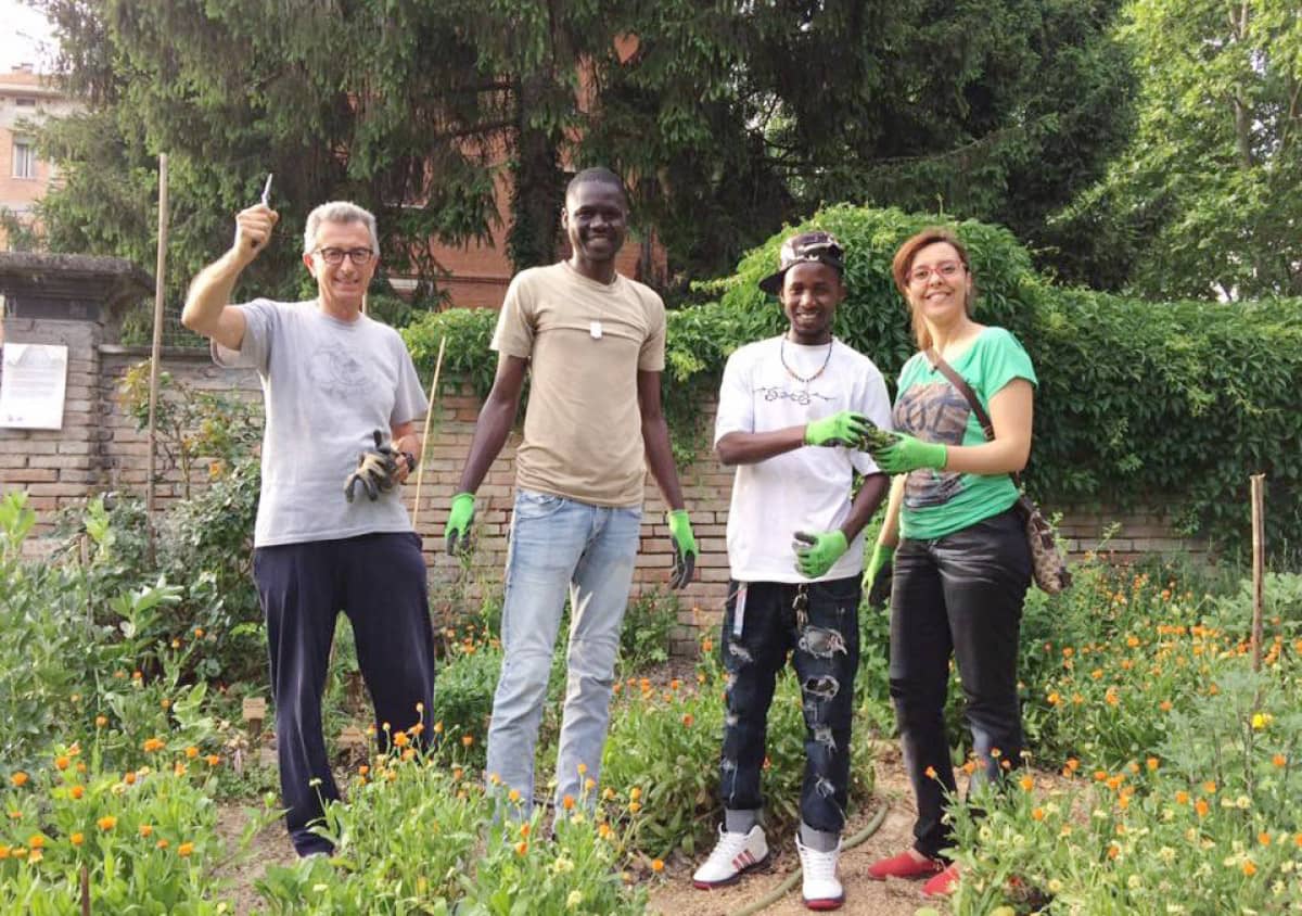 Nella cura dell’orto è stato coinvolto un gruppo di richiedenti asilo. In queste foto Yussupha e Moussa, con Pier e Aouatif