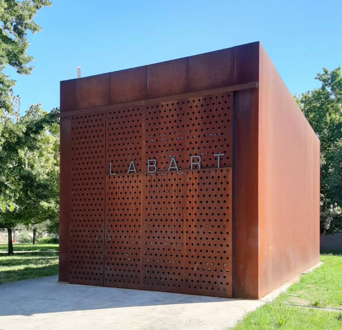 L’intrigante struttura del Labart: un parallelepido color rame in mezzo al parco